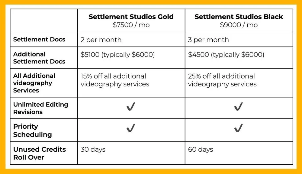 Attorneys who anticipate a higher volume of monthly video production can save a lot of money by subscribing to Settlement Studios Gold or Settlement Studios Black.